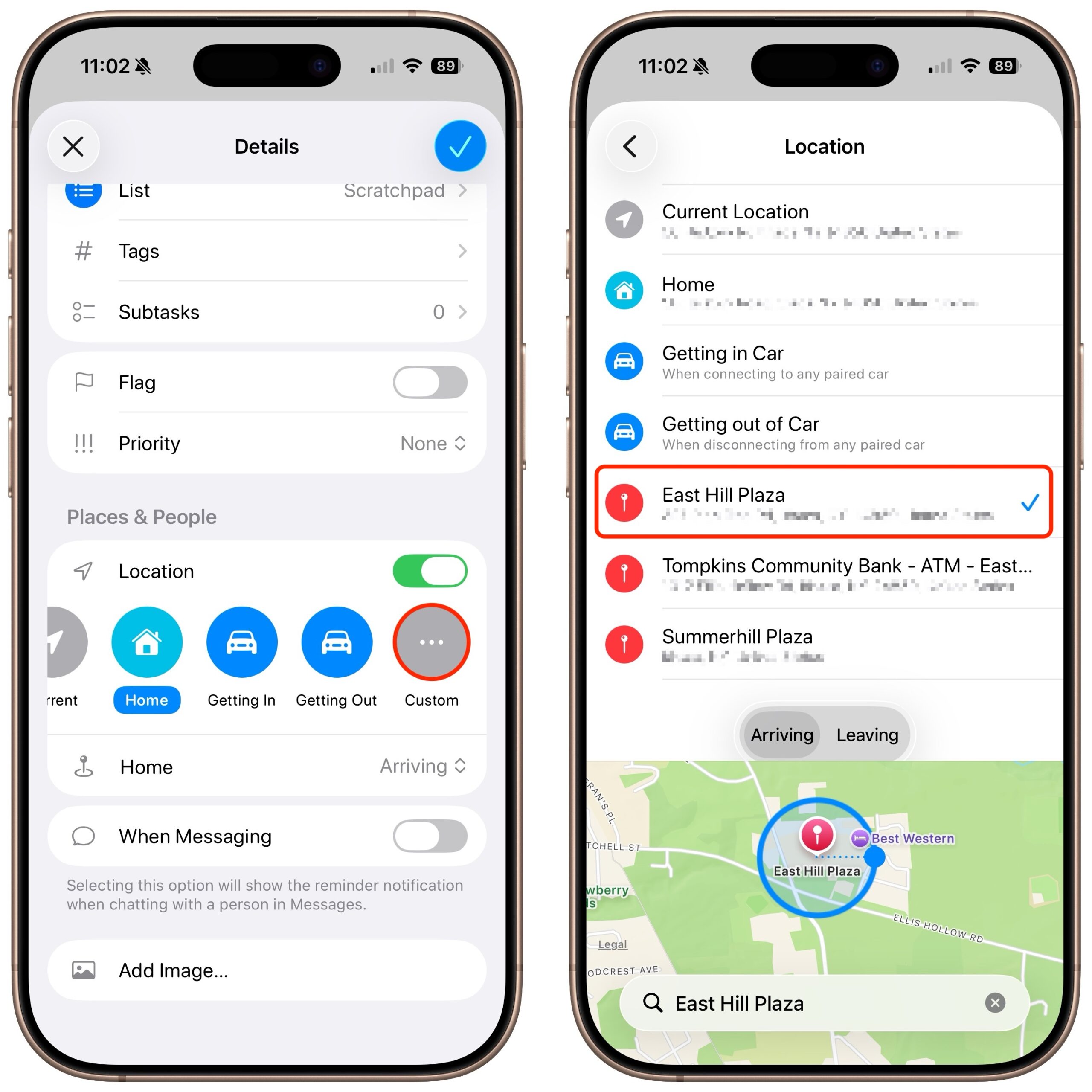 For the location options, you can request alerts when you arrive or leave. To set a custom location, search for an address or point of interest. You can adjust the geofence radius to control how close you need to be for the reminder to trigger.
