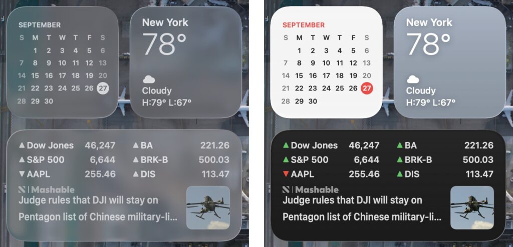 - Widget style: Desktop widgets are now mostly transparent when any window is open on the desktop, and they become solid only when the last window is closed or hidden. You can adjust this setting in System Settings > Desktop & Dock > Dim widgets on desktop. Widgets also adopt the same clear or tinted style used by icons.
