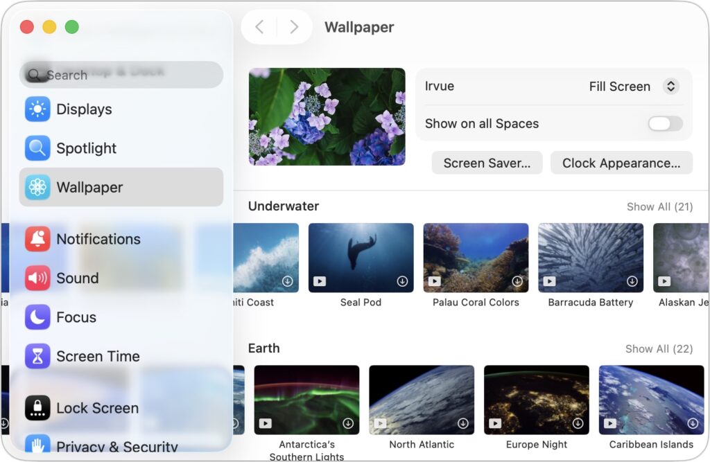 - Sidebars: Although they’re less transparent than other items, sidebars become subtly tinted based on what’s under them. That occasionally results in some awkward overlays, such as in System Settings > Wallpaper, where the thumbnails can scroll underneath the sidebar.