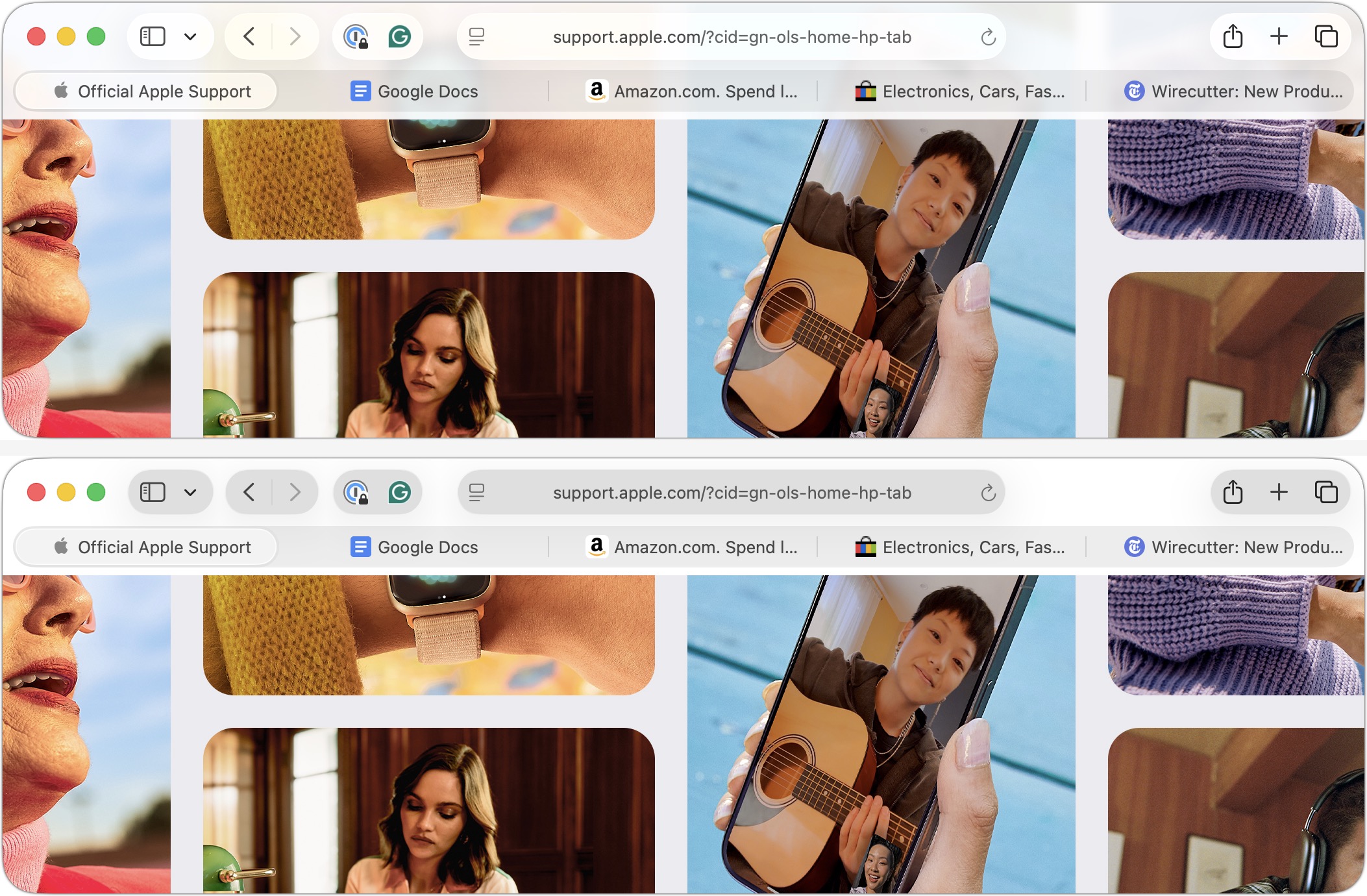 With Safari, Apple’s Liquid Glass interface causes the toolbar controls and the tab bar at the top to float over the page content underneath. On some sites, this can be distracting or make tab titles hard to read (below, top). If that bothers you, turning on System Settings > Accessibility > Display > Reduce Transparency separates the controls from the content more clearly, but also gives them a gray background (below, bottom).