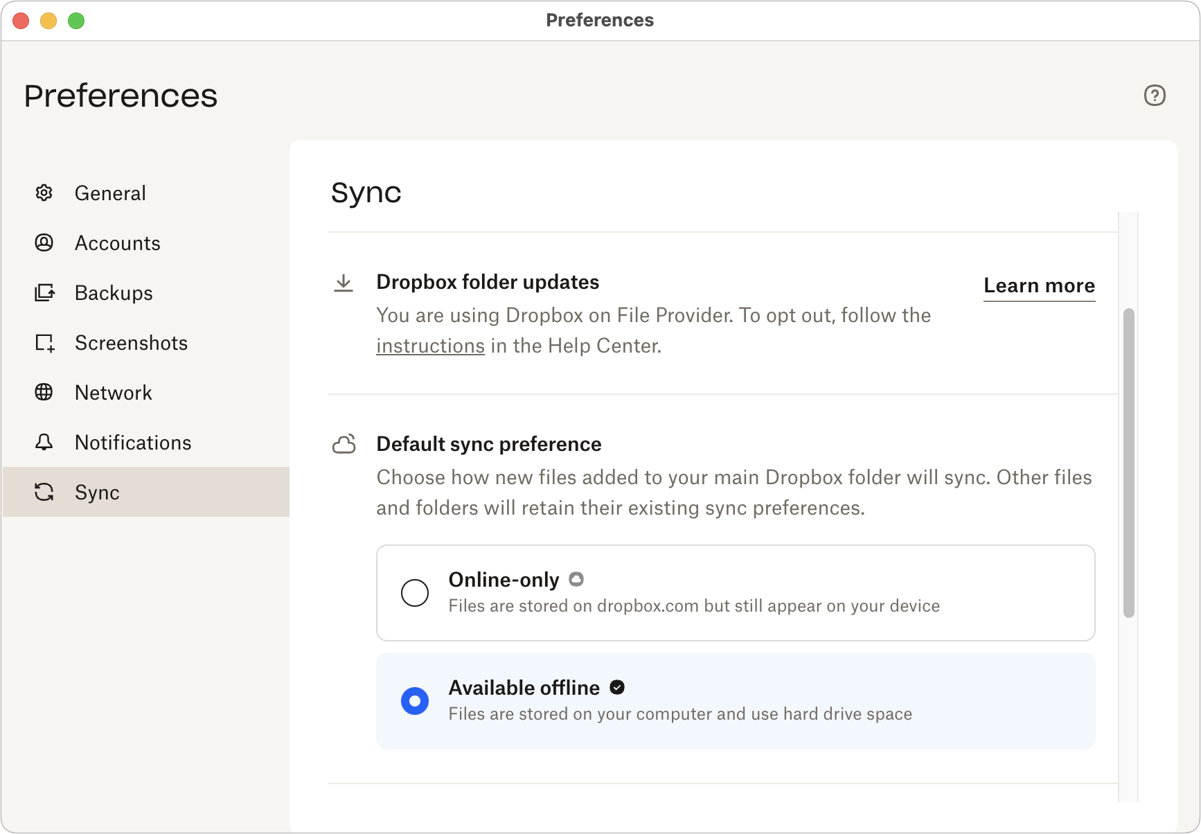 - Dropbox: Click the Dropbox icon in the menu bar and then, in Dropbox > Account > Preferences > Sync, choose Available Offline for the Default Sync Preference. Note that this applies only to new files!