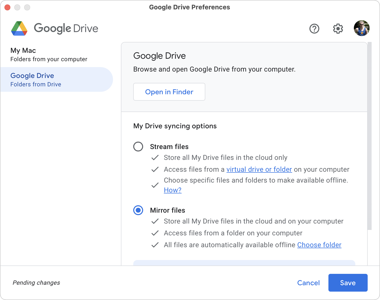 - Google Drive: Click the Google Drive icon in the menu bar, click the gear menu, choose Preferences, click Google Drive, and select Mirror Files for the My Drive syncing options.