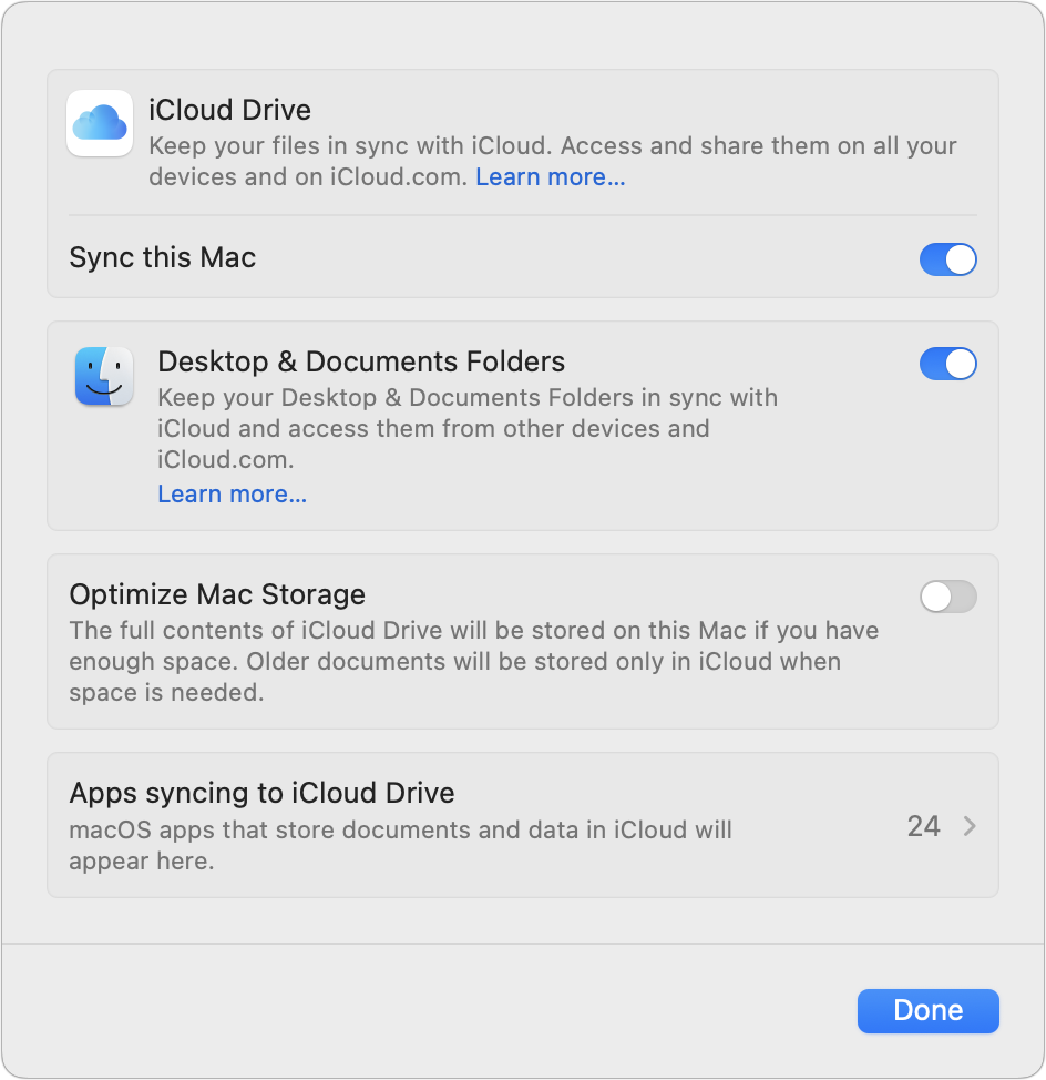 - iCloud Drive: Turn off System Settings > Your Name > iCloud > iCloud Drive > Optimize Mac Storage.